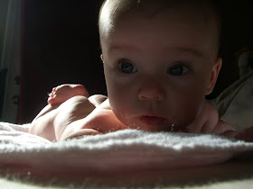 And on the eve of 5 months (!!), Mikaelin has learned so much! On Friday, she rolled over from tummy to back for the first (and second, and third...) time, and she is starting to sit up on her own for a few seconds at a time. She is smiling a lot, and even laughing sometimes (especially when Daddy does something funny), and she's "talking" up a storm. She likes to open and close her mouth like a trout without making any sounds =) She is most vocal and interactive on the changing table.