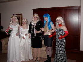 One year, for Halloween, we went as Barbies. We had, from left-right, Wedding Day Barbie, Fairy Princess Barbie, Businesswoman Barbie, Rockstar Barbie, and Glamour Barbie. I think we won the costume contest for group costume.